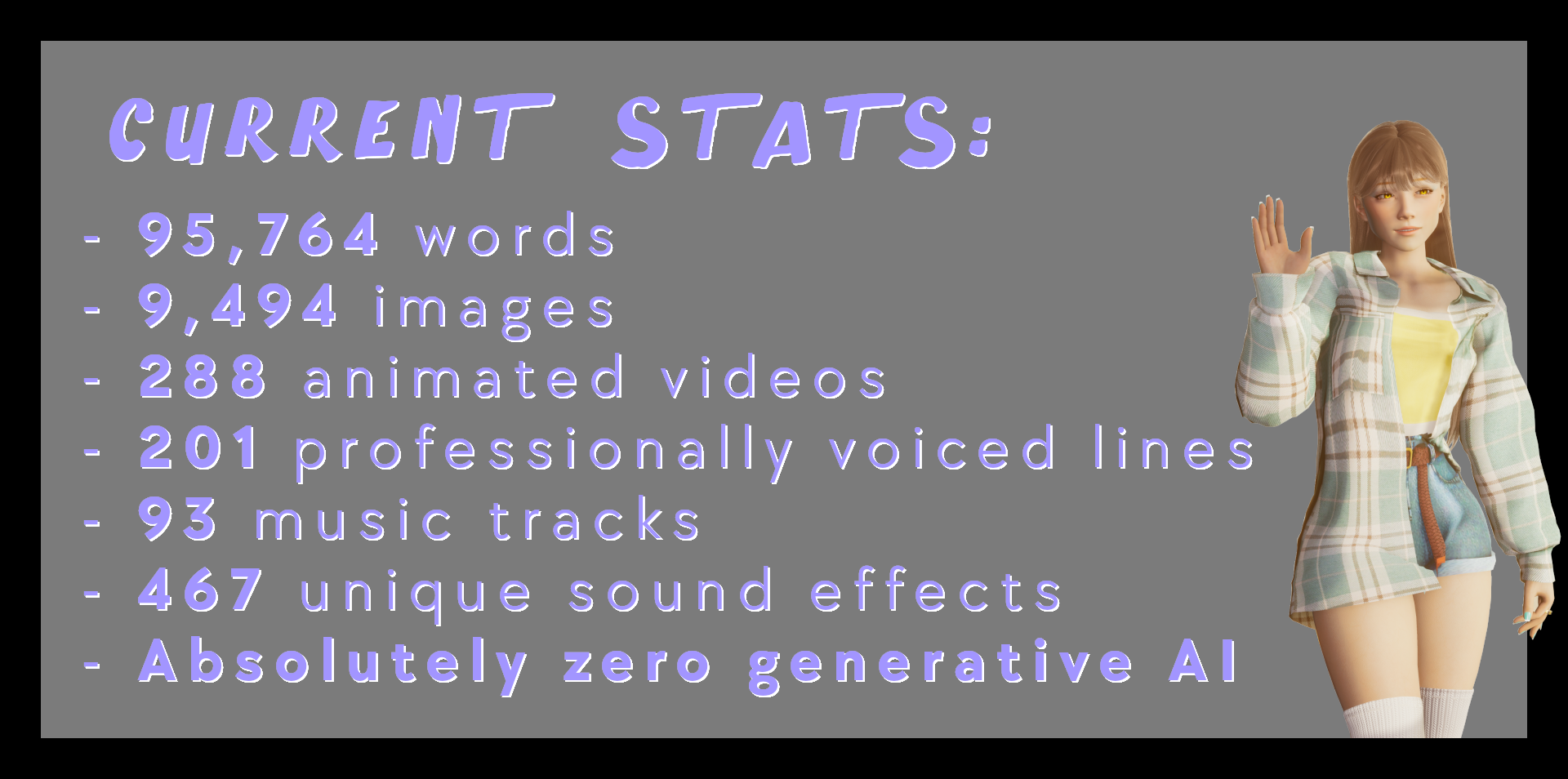 Just needed to comment: This is genuinely one of the more well-written VNs I've played recently. It's consistently engaging, its paced really well, and you've made the characters (and protag) so incredibly likeable in a very natural way. The slapstick humor and meta stuff is also done really well -- a lot of times it comes across really heavy-handed in other VNs but you space it out really well.